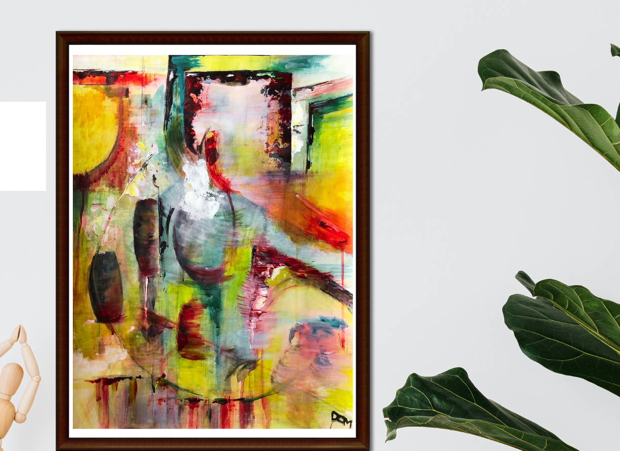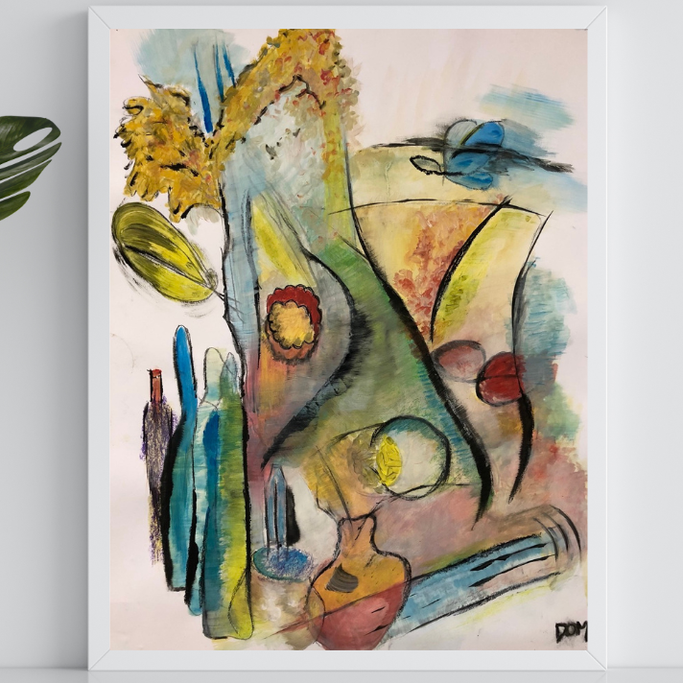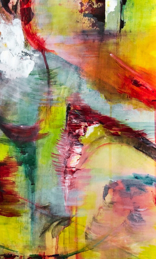 Cette œuvre propose une immersion dans un espace abstrait où les couleurs se heurtent, se fondent et se superposent en une danse fluide. Les aplats lumineux, parfois éclatants, contrastent avec des zones plus sombres, créant une tension entre l’ombre et la lumière. Les formes esquissées semblent évoquer des fragments d’objets ou de souvenirs, sans jamais se figer dans une définition précise : le regard oscille entre reconnaissance et perte de repère.